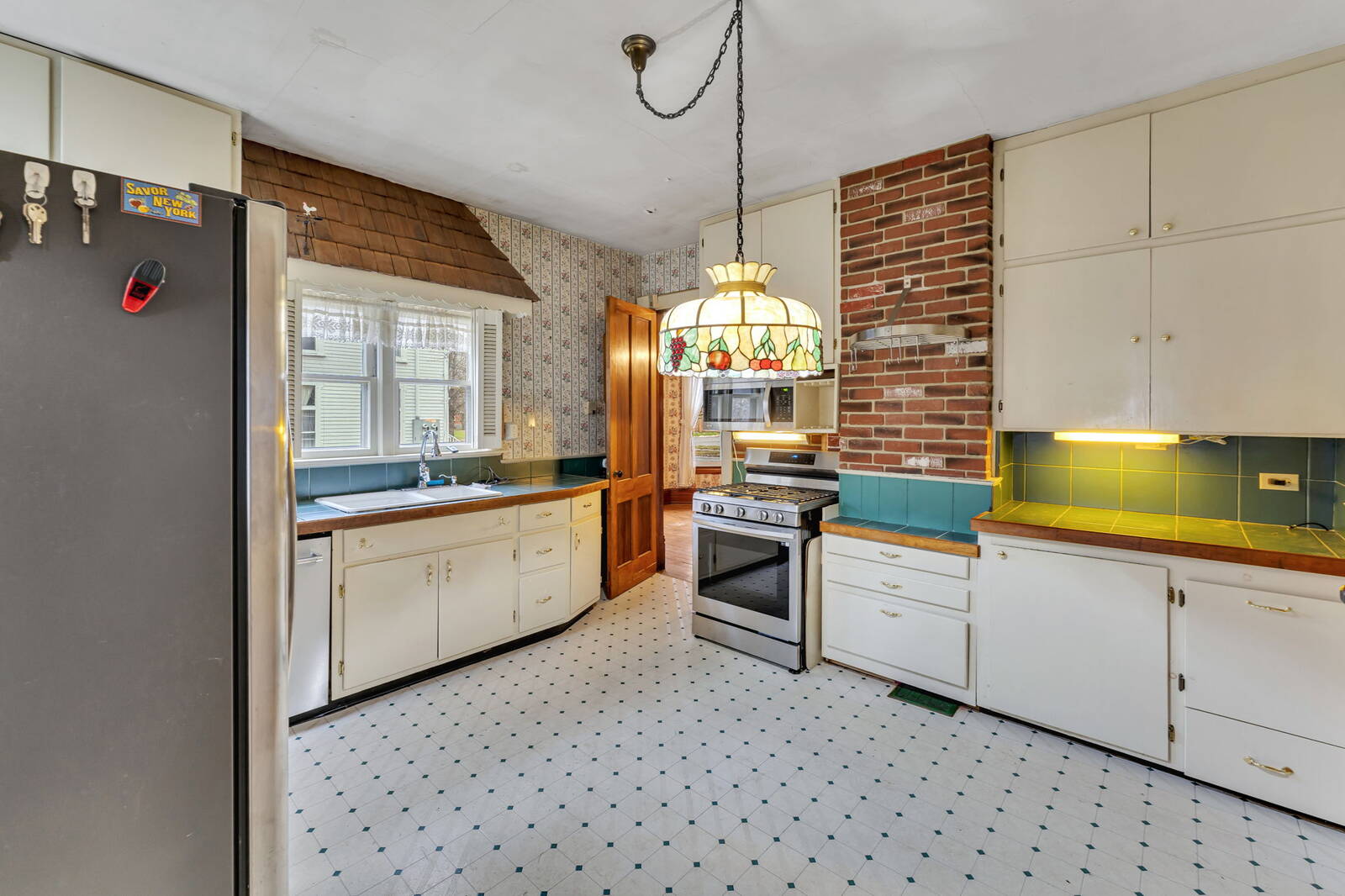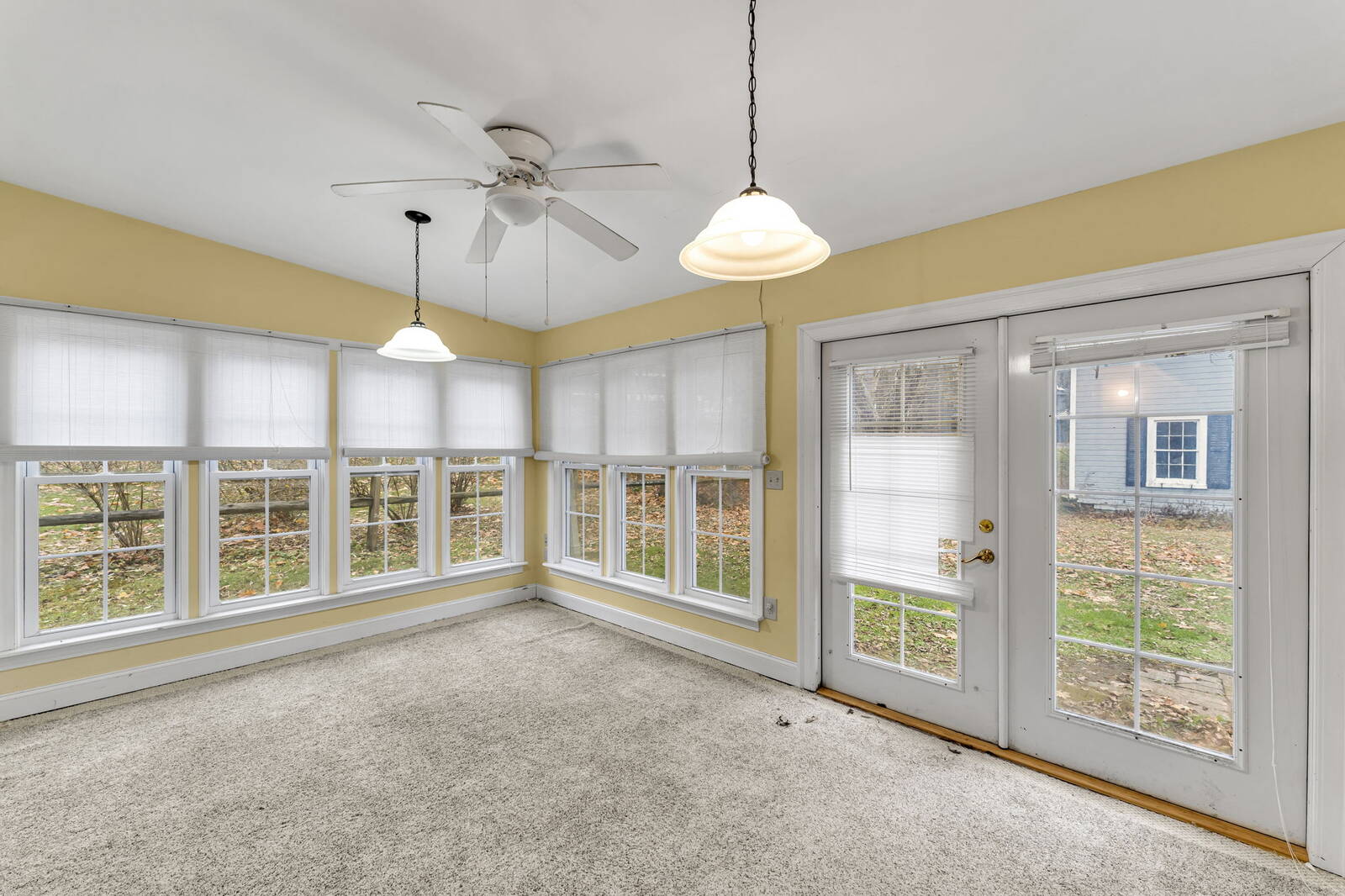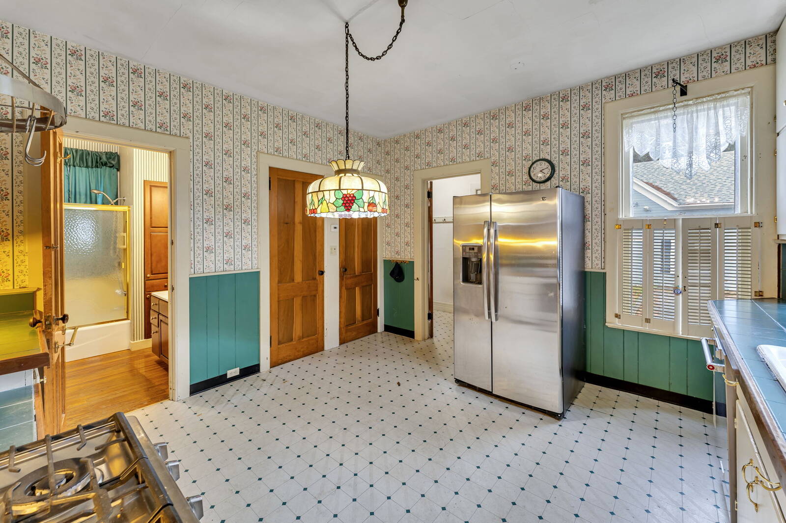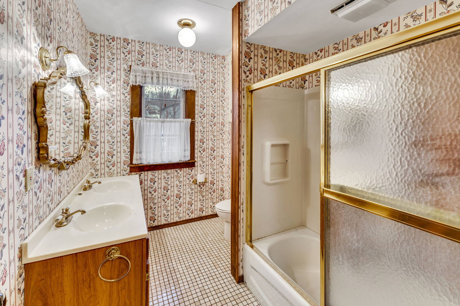 The dining room opens to a vine-draped sitting porch, creating a magical outdoor nook ideal for morning coffee or relaxed evenings with friends and family. Convenience meets comfort on the main level with a full bath, a rear mudroom entry, extra pantry space, and a charming enclosed room that serves as a delightful three-season retreat.